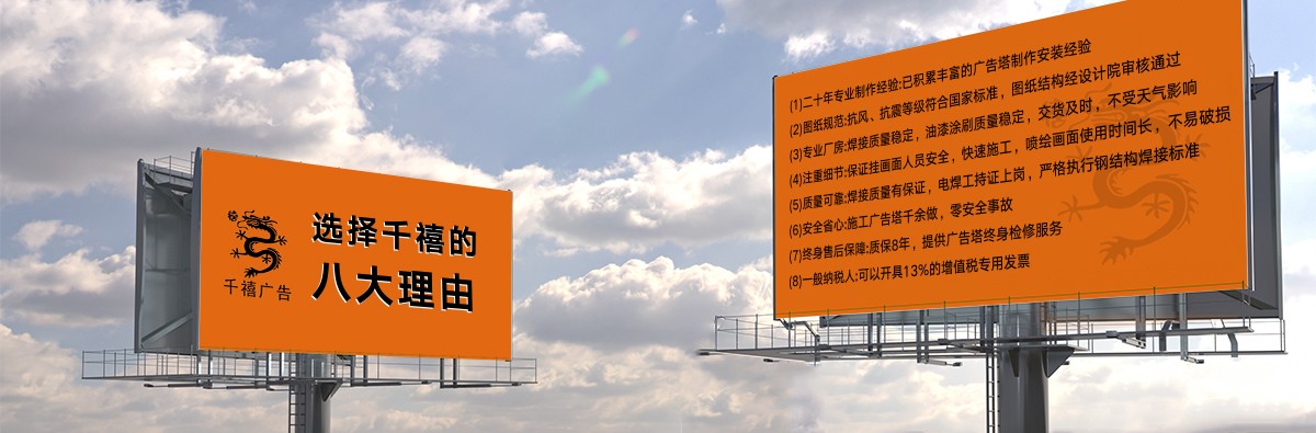 世紀之交,石家莊千禧廣告裝飾有限公司(下方簡稱千禧廣告公司或公司)自2000年10月10日創立伊始,即在燕趙大地落地生根,成長為國內擁有23年施工經驗的實體型戶外廣告設施制作工廠。公司集新品研發、結構設計、生產制作、施工建造于一體,現代化生產廠房為大中型高炮廣告牌(又稱高炮廣告塔、單立柱廣告牌、單立柱廣告塔、擎天柱廣告塔、擎天柱廣告牌)、龍門架、三面翻鋼結構、LED廣告屏鋼結構等的精益生產、高效流水化作業,產品交工質量過硬,公司擁有現代化生產車間,配備了不可或缺的硬件裝備。